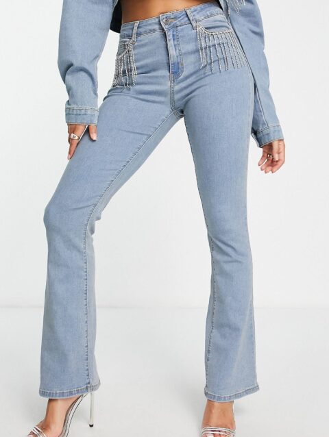 Rhinestone Fringe Boot Cut Flared Jeans Ice Blue