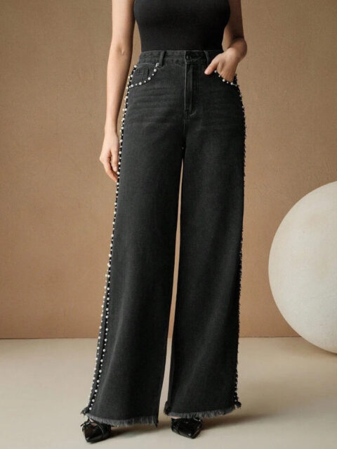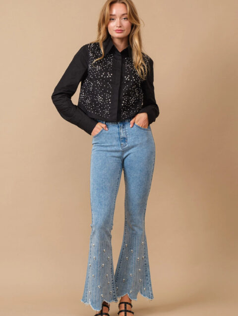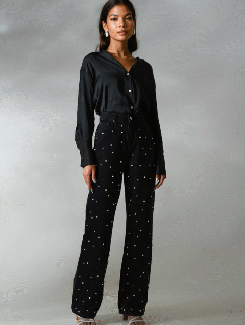 Rhinestone and Pearl Studded Wide Leg Jeans – Black