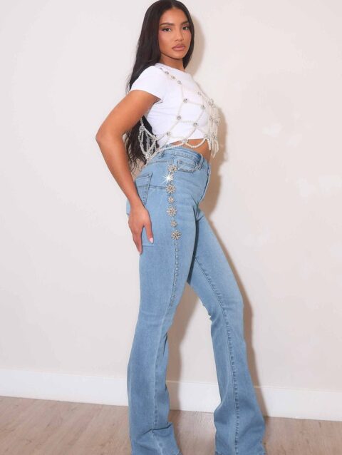 High Rise Rhinestone Embellished Boot Cut Flared Jeans – Ice Blue