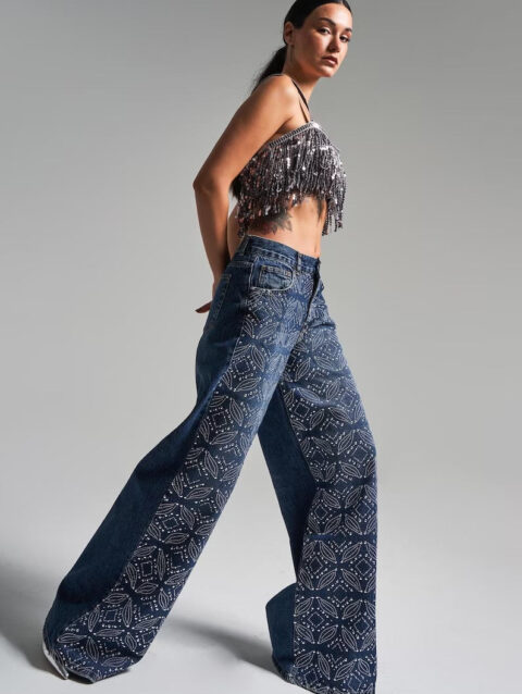 Cut Out Rhinestone Embellished Wide Leg Jeans