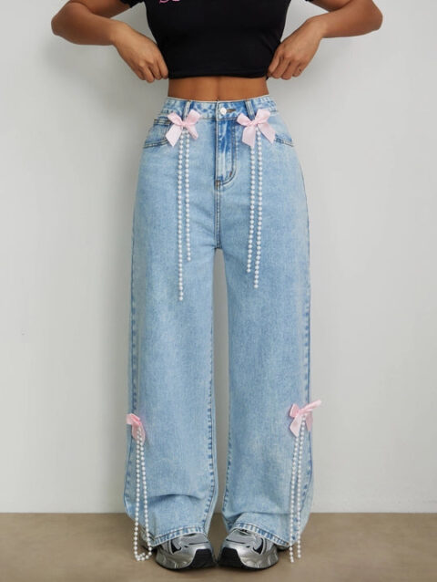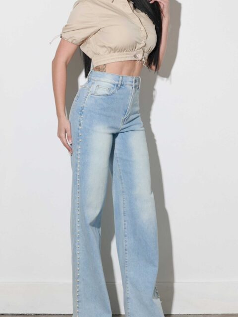 Pearl Studded Wide Leg Jeans – Ice Blue
