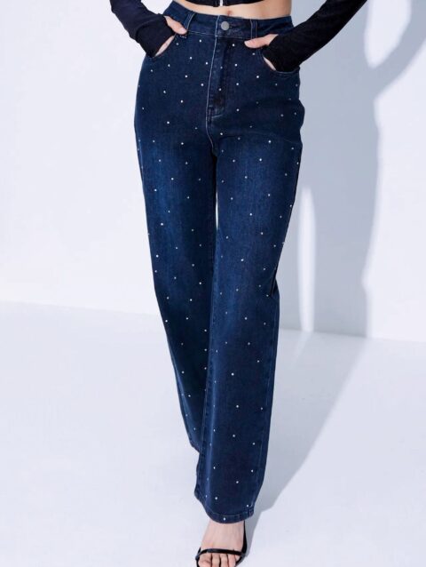 Emma – Rhinestone Embellished Wide Leg Jeans – Dark Blue