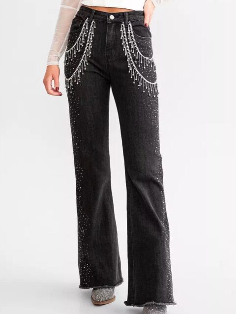 Rhinestone and Pearl Studded Wide Leg Jeans – Black
