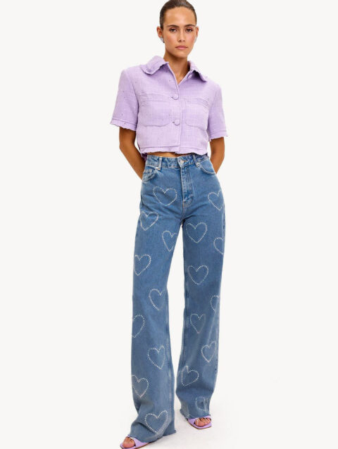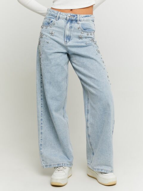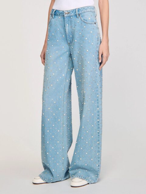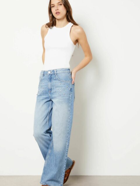 Pearl Affair – Pearl Embellished Wide Leg Jeans – Stone blue