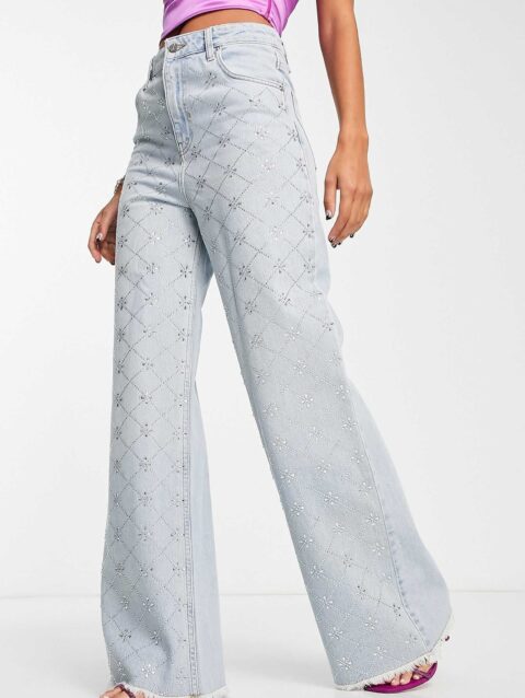 Ophelia – Pearl Embellished Wide Leg Jeans – Ice Blue