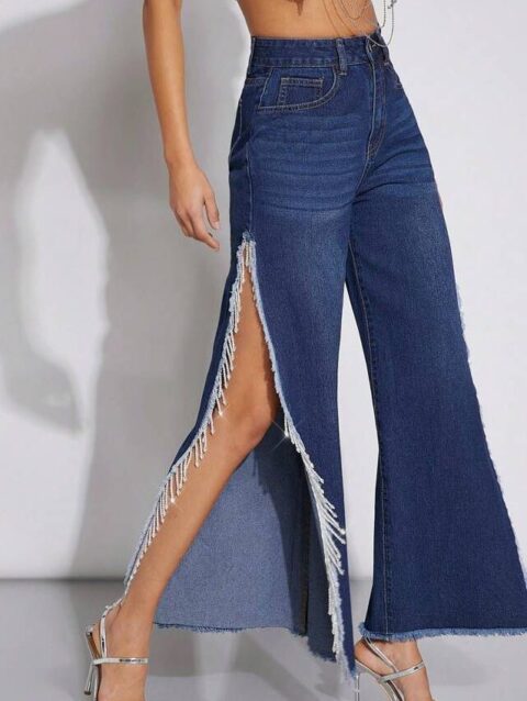 Aurora – High Rise Side Slit Tassel Jeans – Midnight Blue
