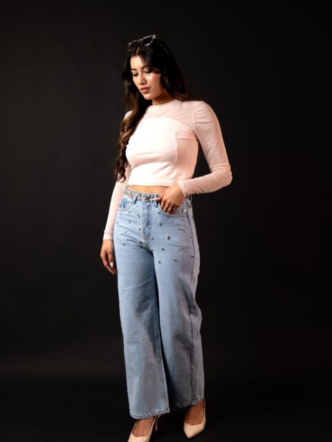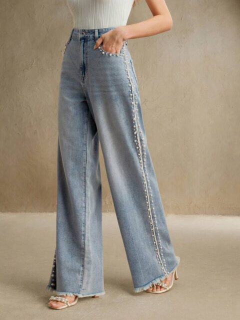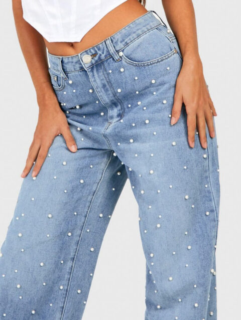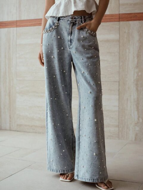 Pearl Studded Wide Leg Jeans – Ice Blue