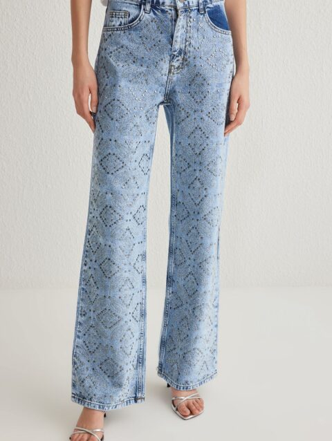 Rhinestone Embellished Wide Leg Jeans Stone Blue