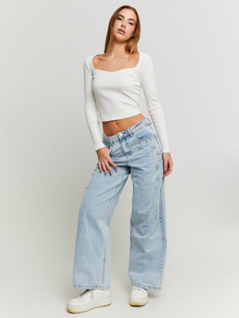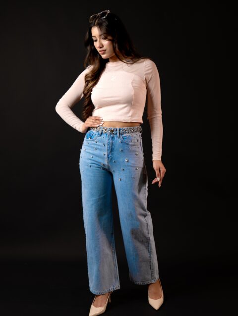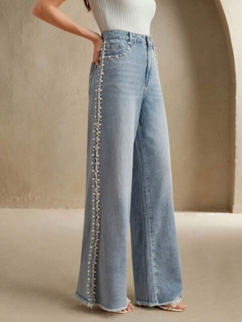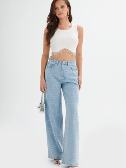 Pearl Studded Wide Leg Jeans – Ice Blue