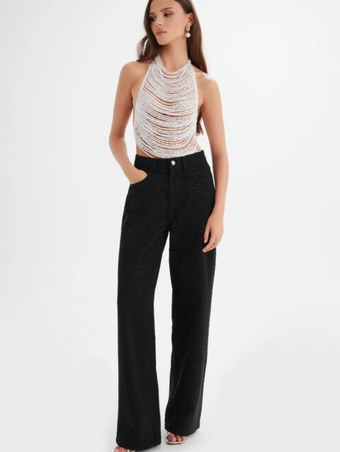 Rhinestone and Pearl Studded Wide Leg Jeans – Black