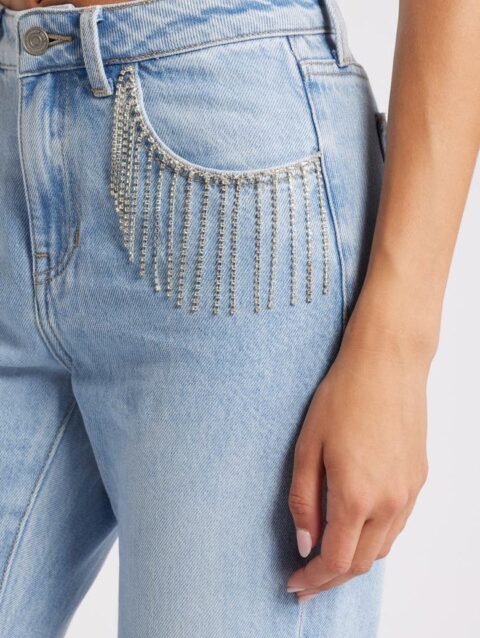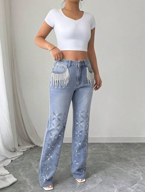 Rhinestone Tassel Wide Leg Jeans – Ice Blue