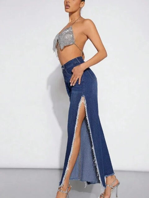 Aurora – High Rise Side Slit Tassel Jeans – Midnight Blue