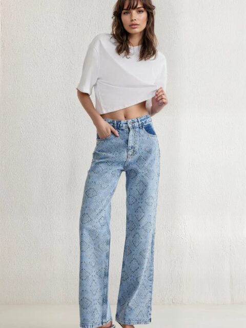 Rhinestone Embellished Wide Leg Jeans Stone Blue