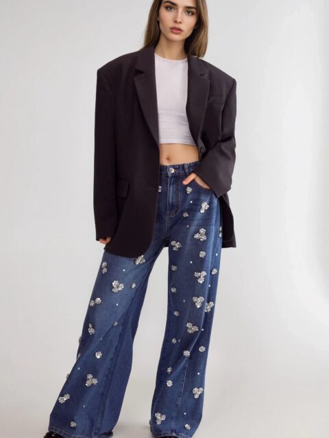 Flower Applique Rhinestone Embellished Wide Leg Jeans