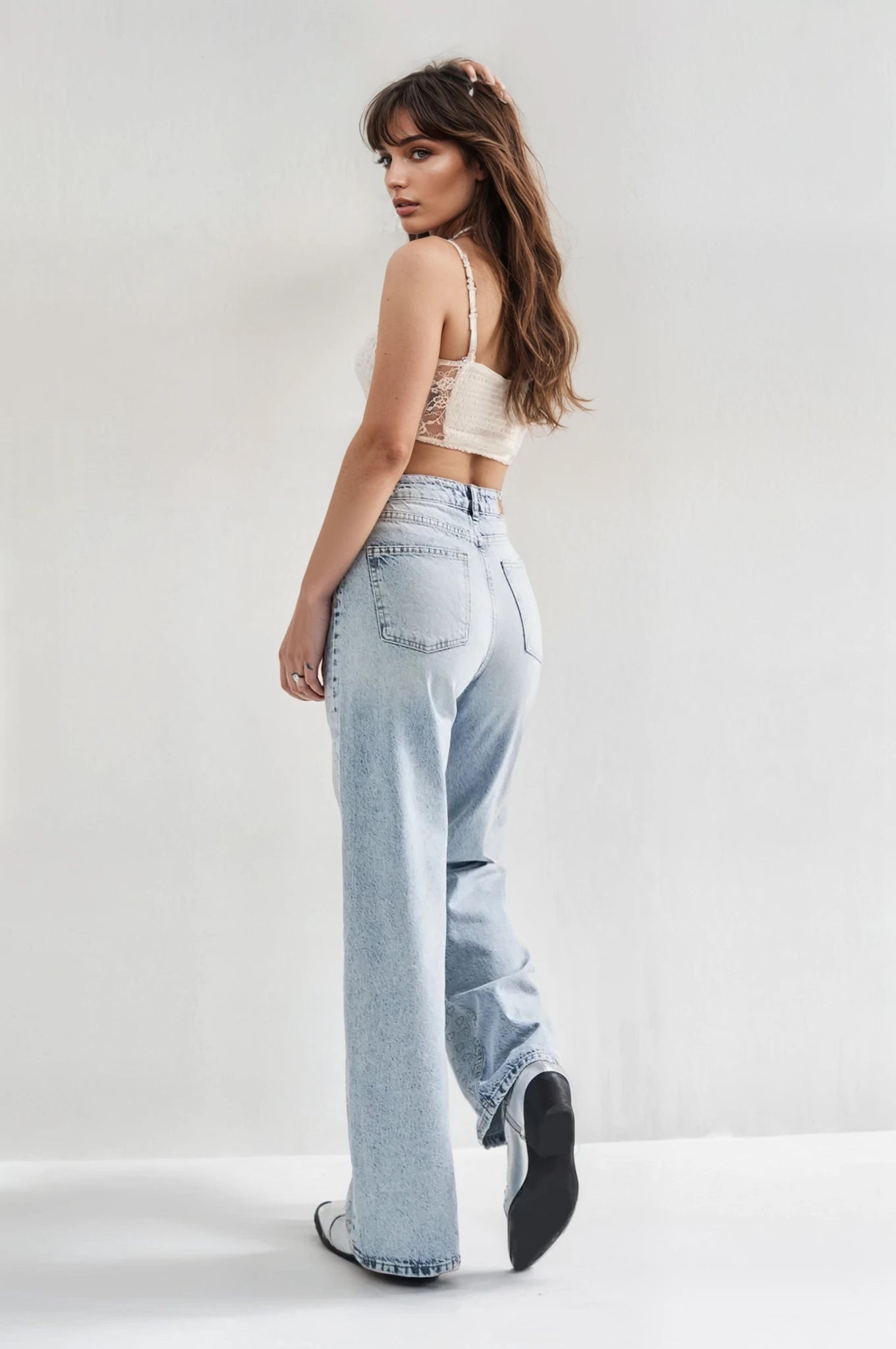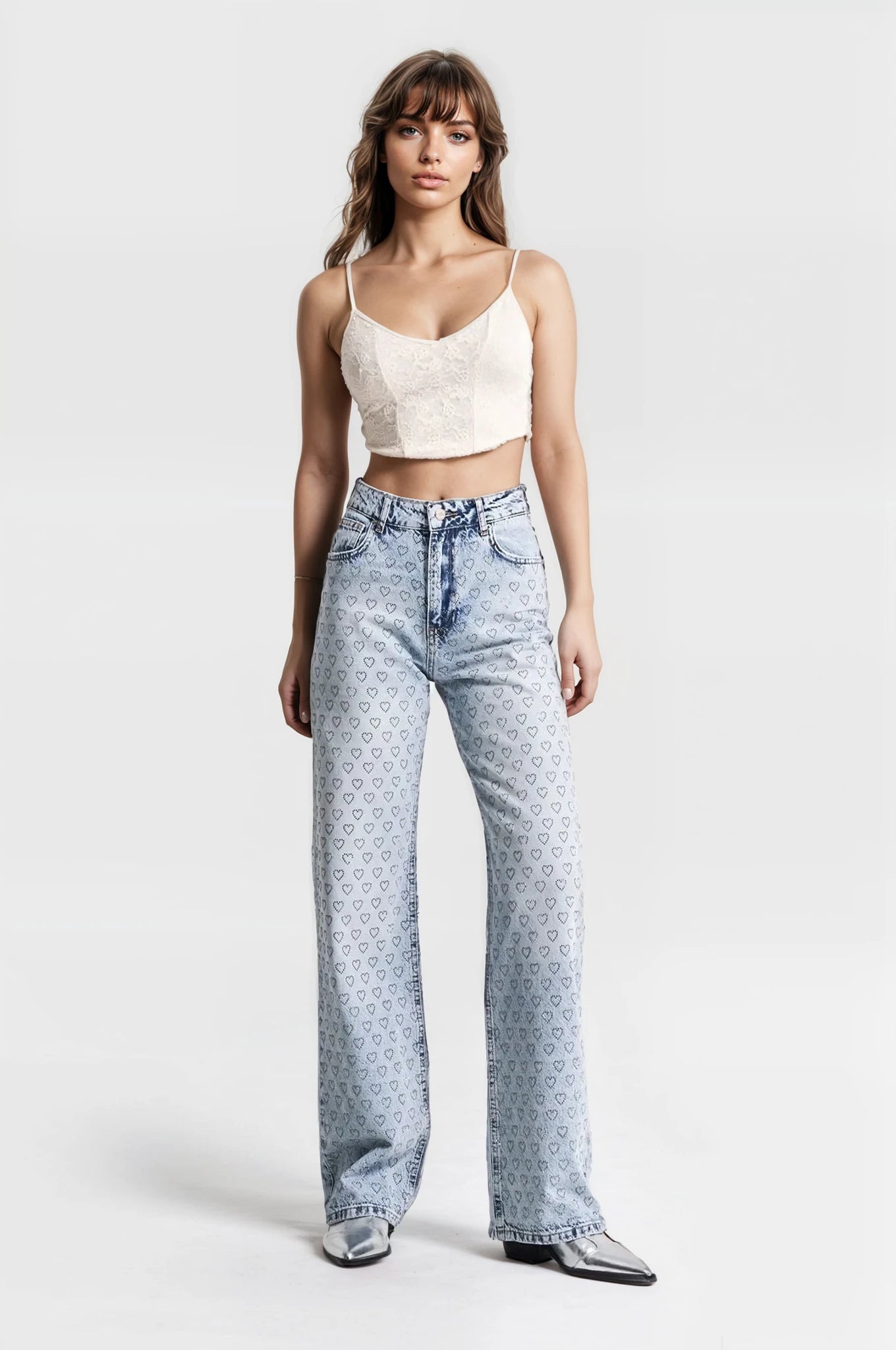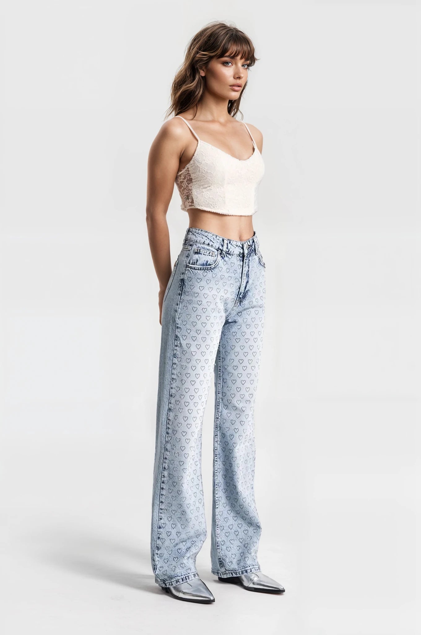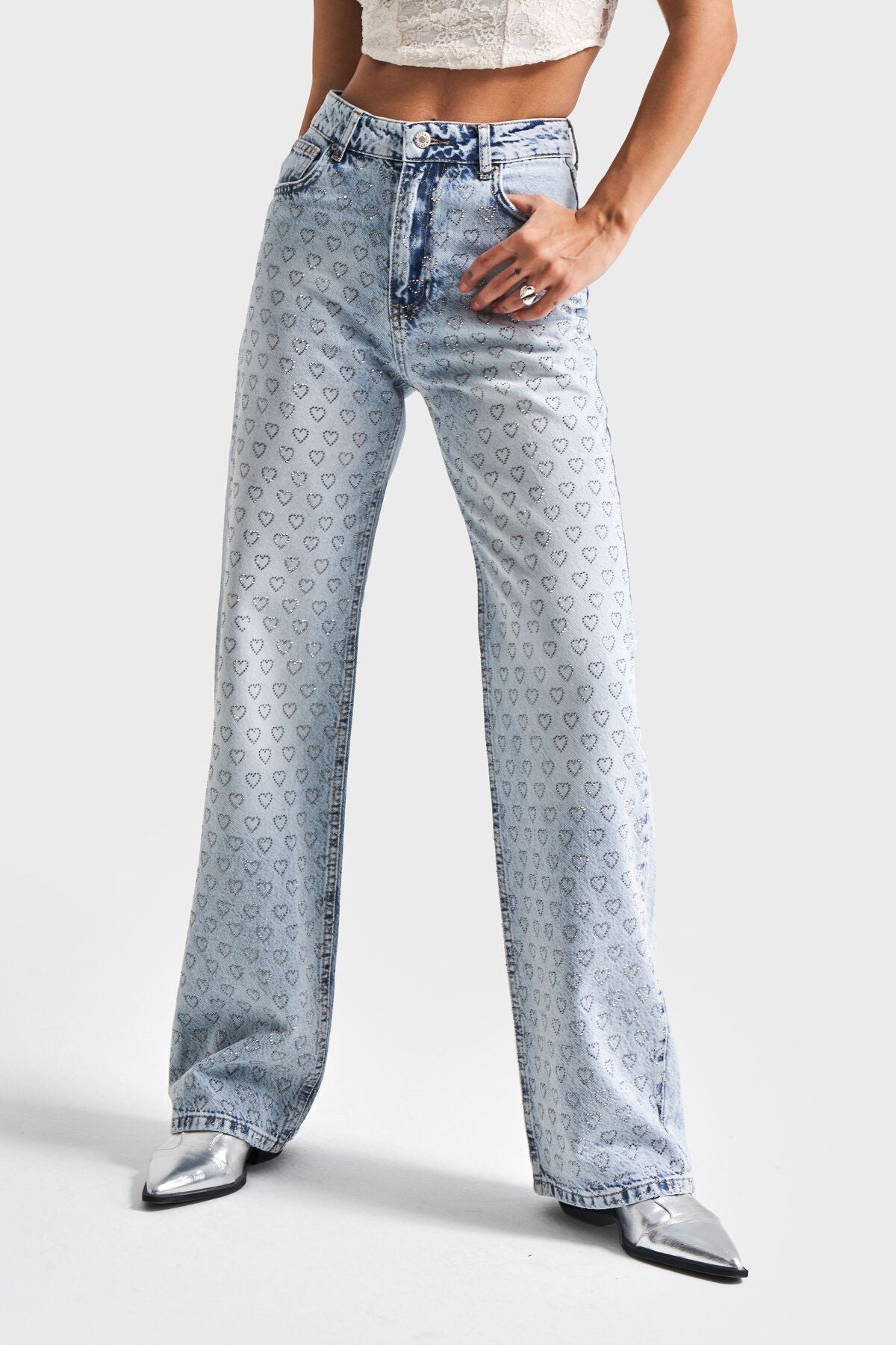 Ivory Bloom – Rhinestone Embellished Wide Leg Jeans – IceBlue
