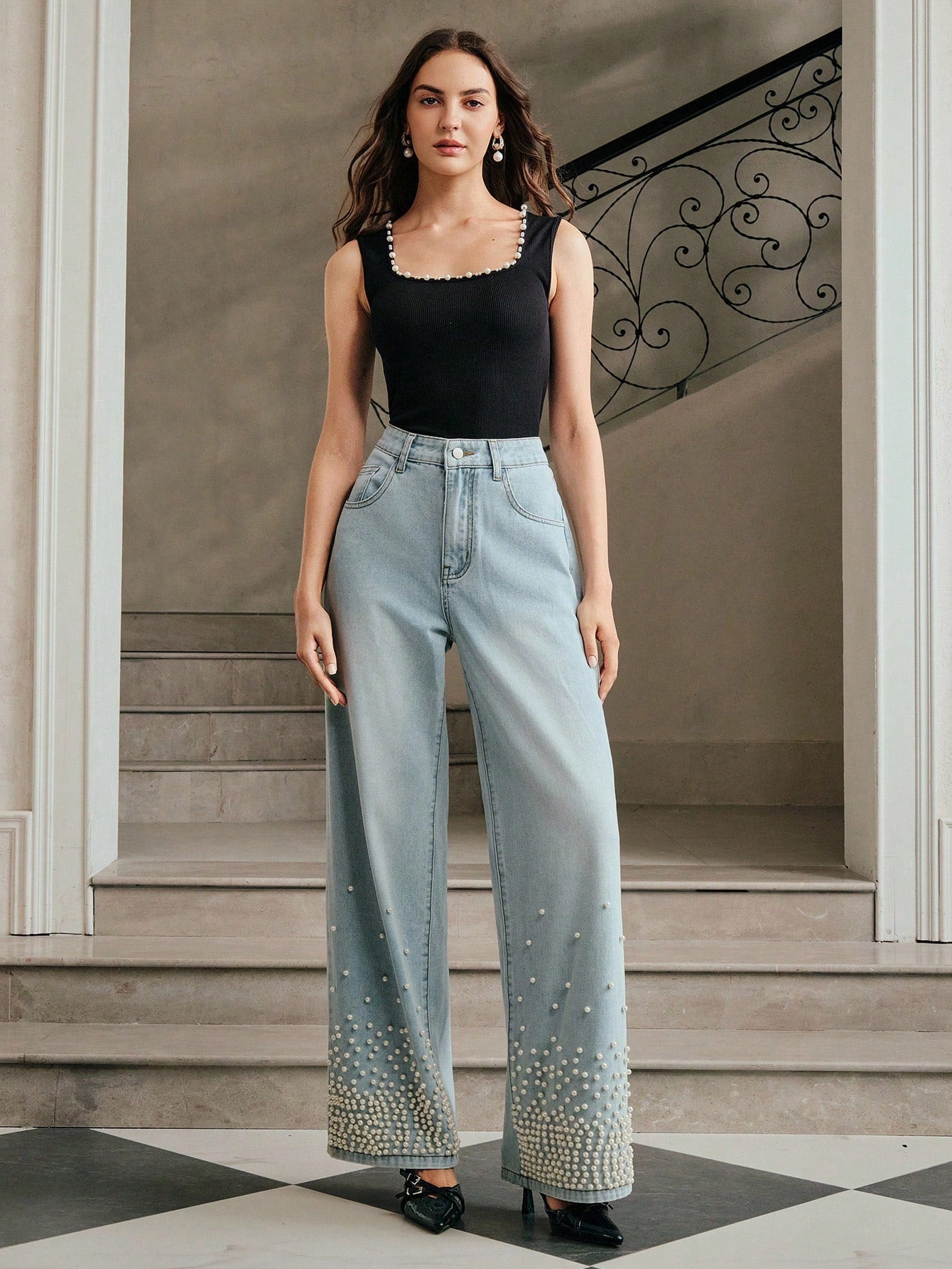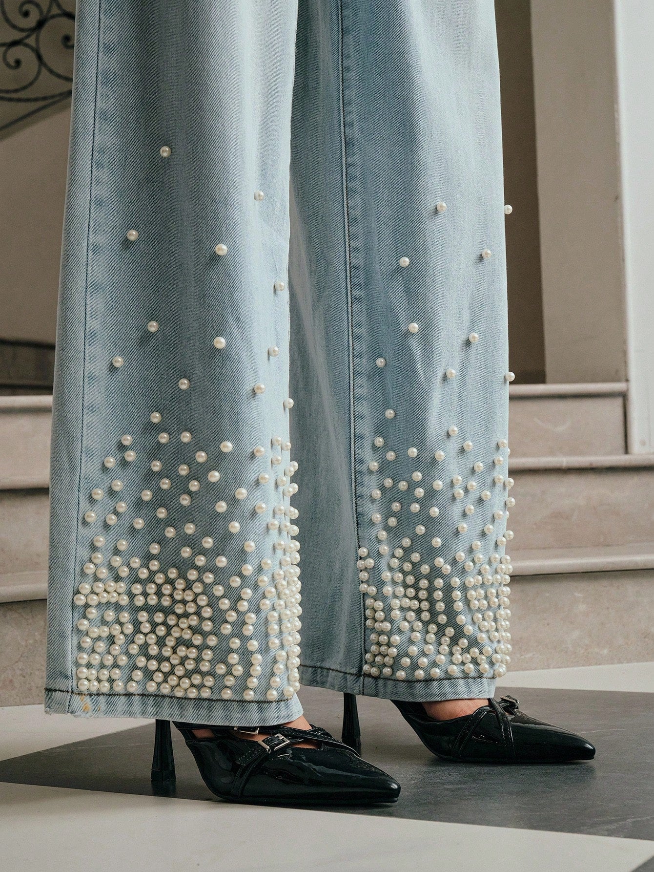 Alina – Pearl Embellished Wide Leg Jeans – Ice Blue