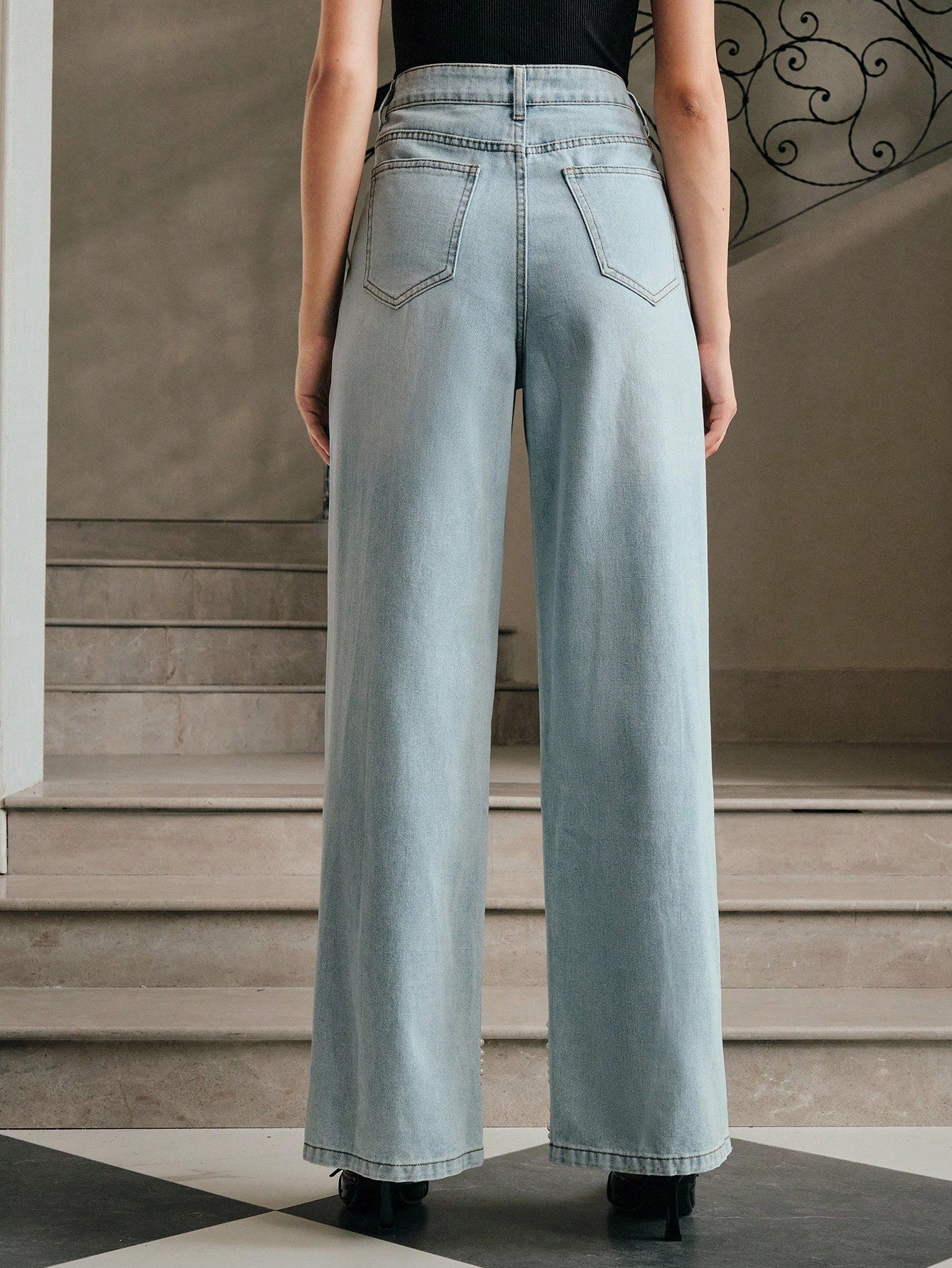 Flower Bliss – Rhinestone Embellished Wide Leg Jeans – Ice Blue