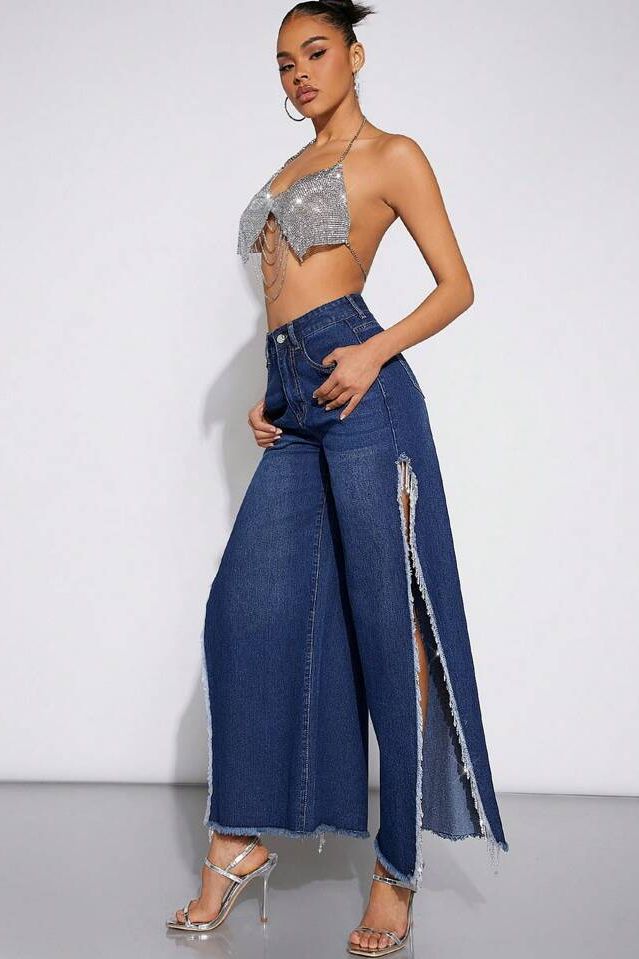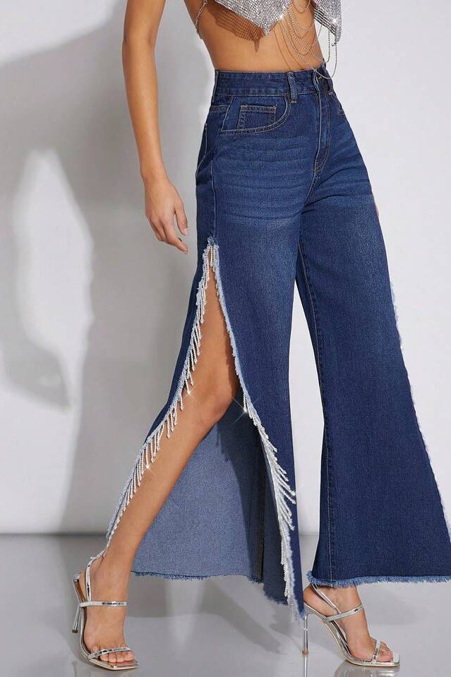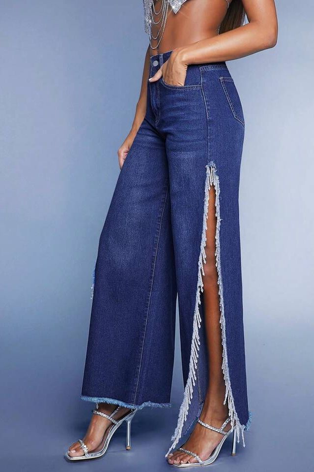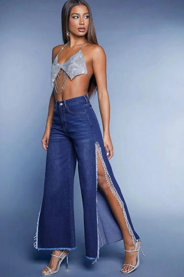Get ready to feel like a star in our side slit wide leg tassel jeans! These versatile and stylish jeans not only give you a chic look, but the added rhinestone tassel provide a glamorous touch.