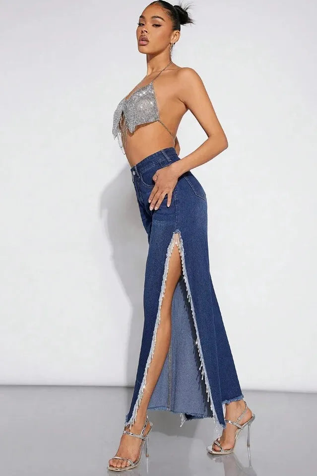 Aurora - High Rise Side Slit Tassel Jeans - Midnight Blue