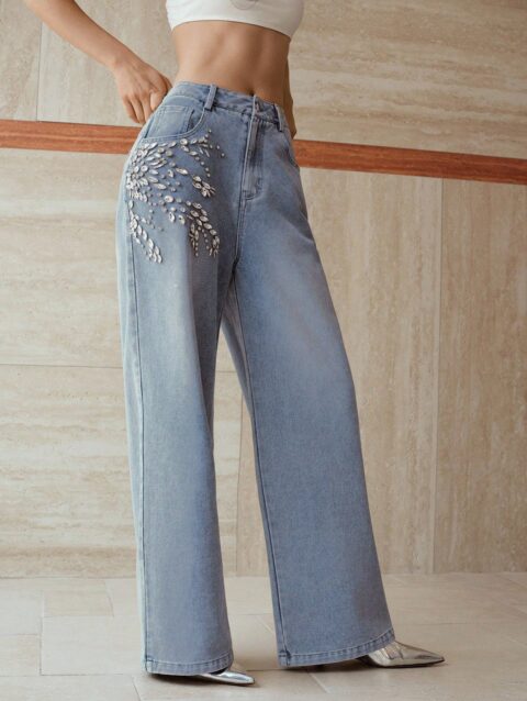 Starline – Rhinestone Embellished Wide Leg Jeans – Stone Blue
