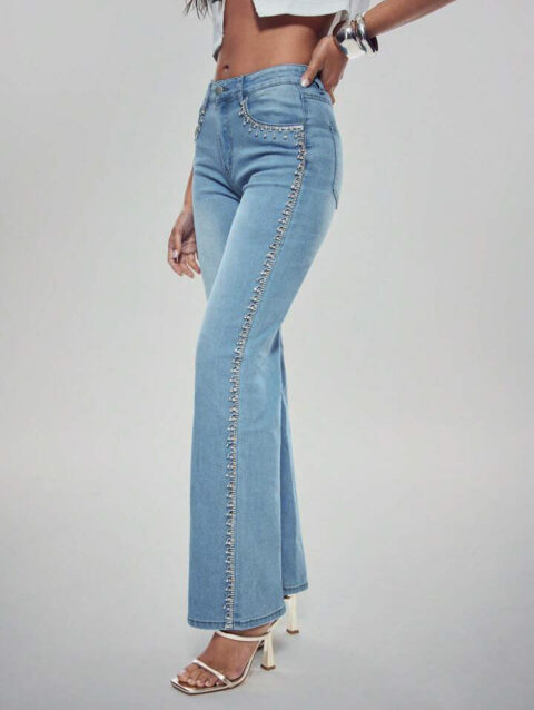 Get ready to feel like a star in our pearl embellished boot cut flared jeans! These versatile and stylish jeans not only give you a chic look, but the added rhinestones provide a glamorous touch.