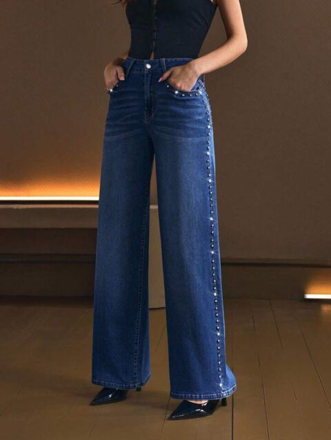 Myra – High Rise Pearl Embellished Wide Leg Jeans