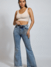 Boot Cut Side Slit Embellished Jeans in a Medium Wash – a fusion of classic style and modern comfort. Elevate your denim game with these versatile jeans that feature a stylish boot cut and a unique side slit embellished detail