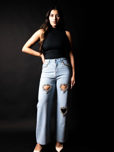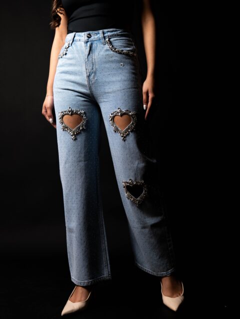 Cupid’s Charm – Rhinestone Embellished Cut Out Jeans – IceBlue