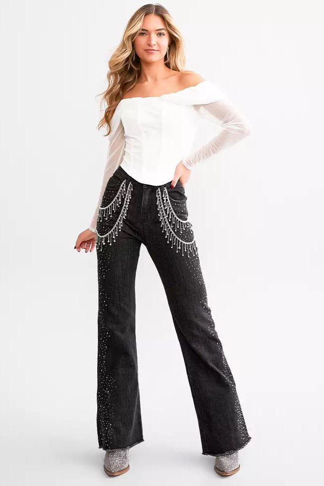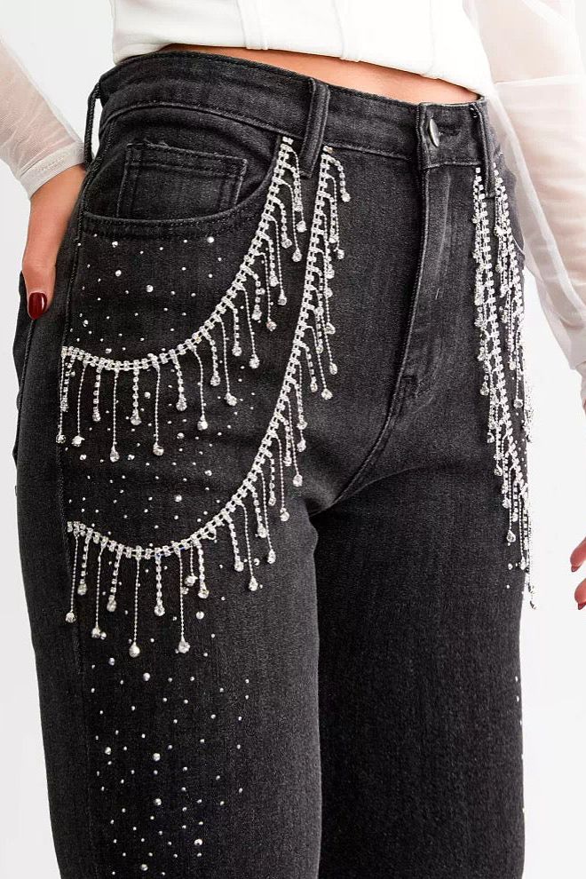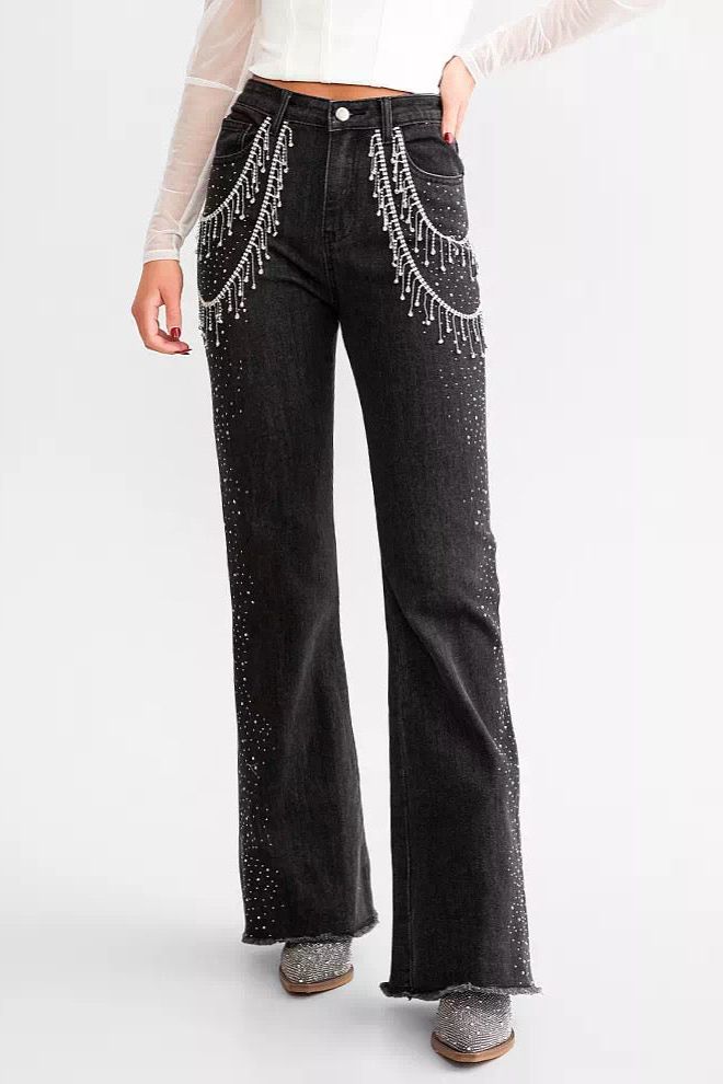 Black Diamond Mist – Rhinestone Embellished Wide Leg Jeans