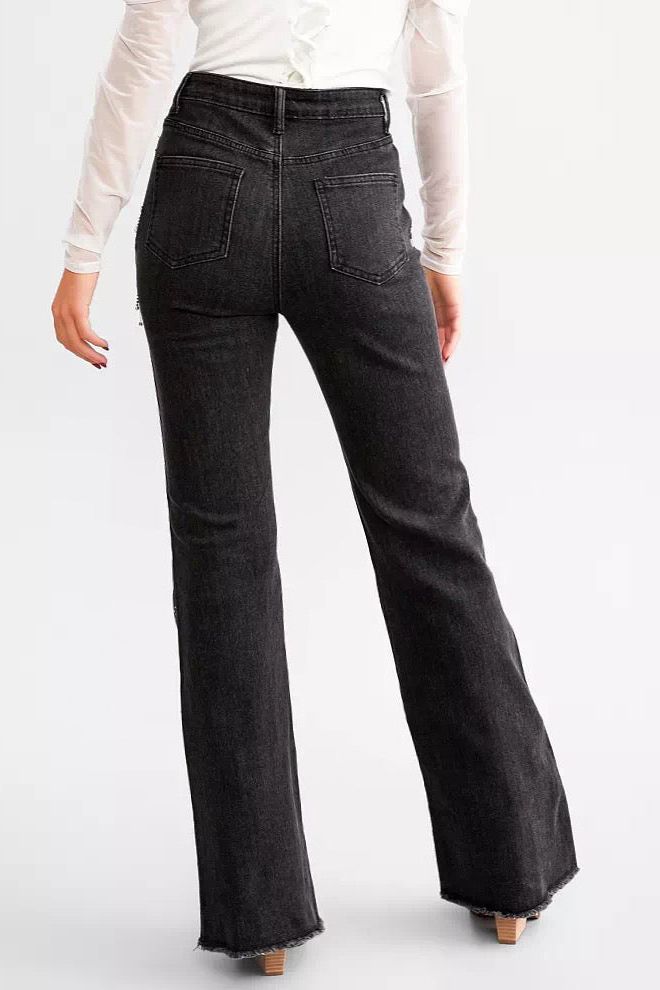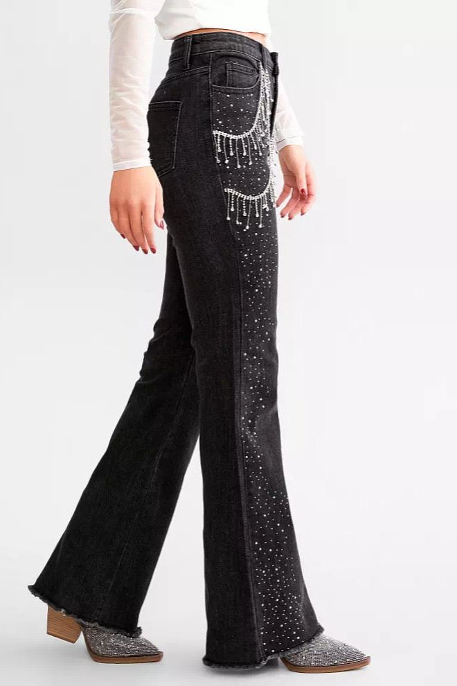 Get ready to feel like a star in our rhinestone wide leg flared jeans! These versatile and stylish jeans not only give you a chic look, but the added rhinestones provide a glamorous touch.