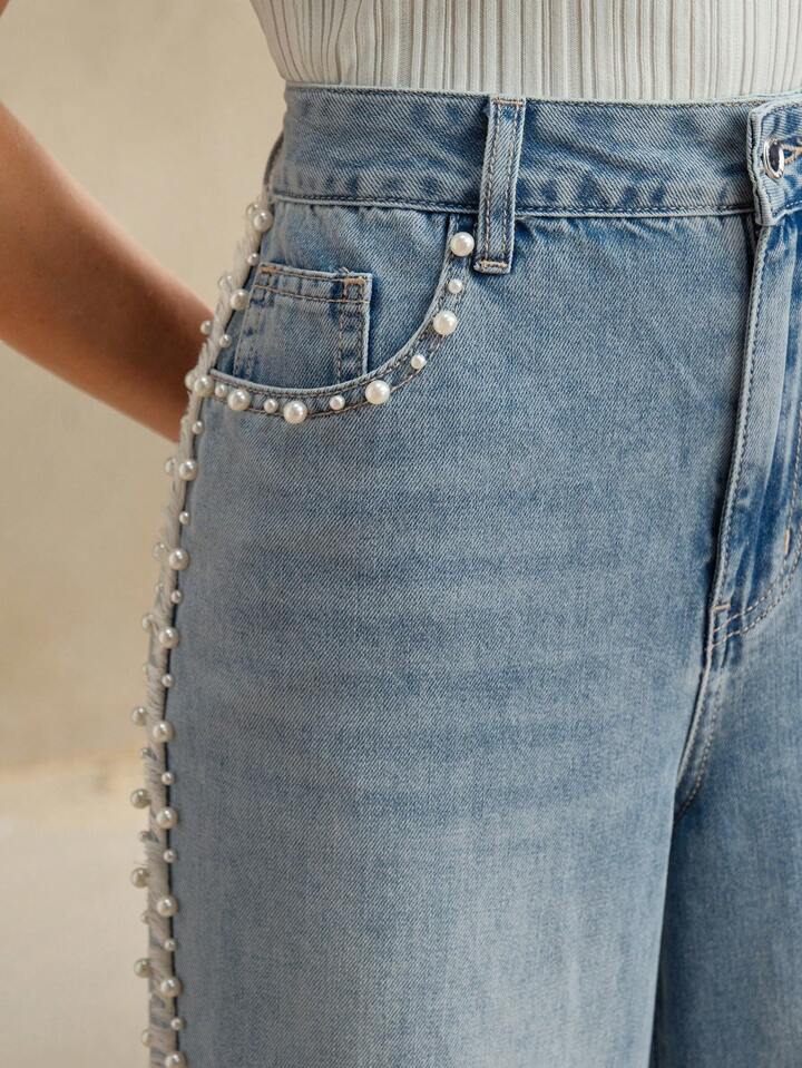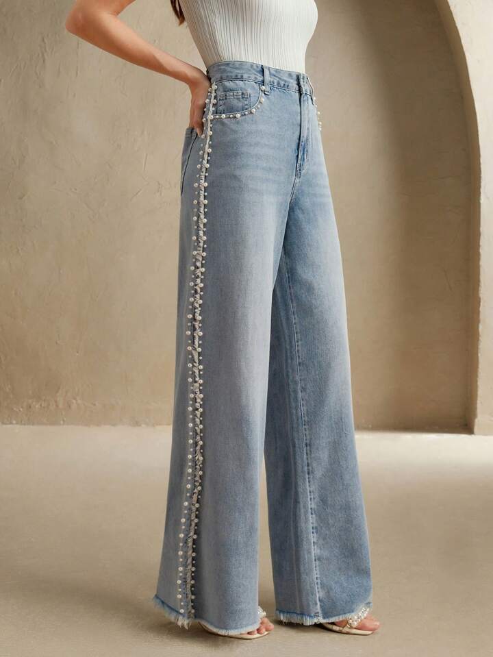 Myra – High Rise Pearl Embellished Wide Leg Jeans