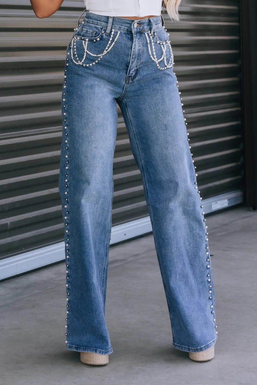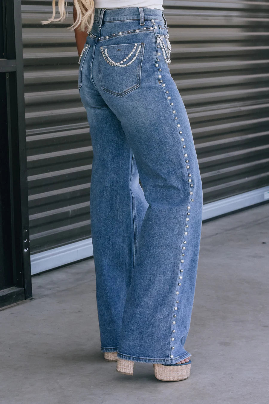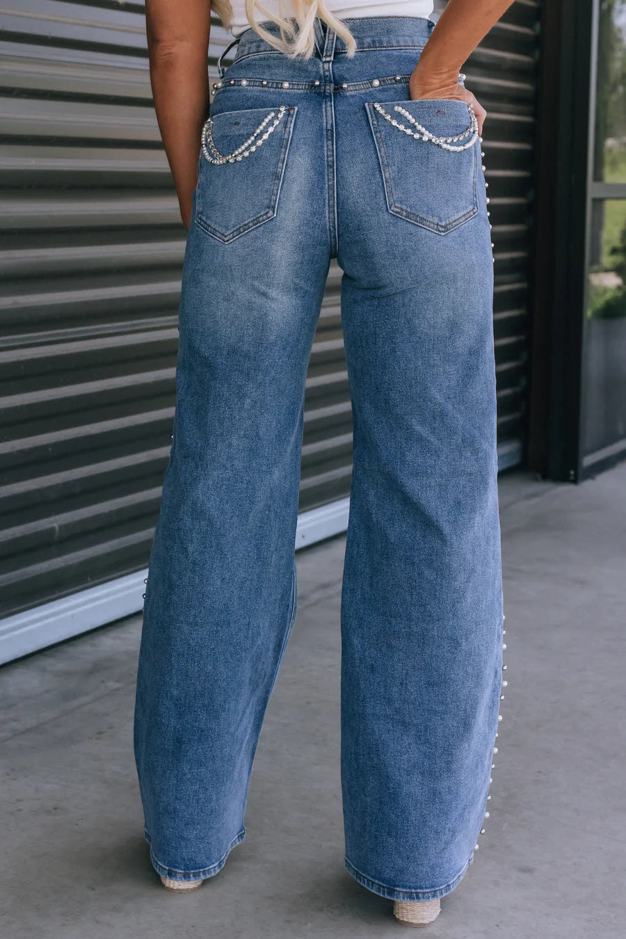Myra – High Rise Pearl Embellished Wide Leg Jeans