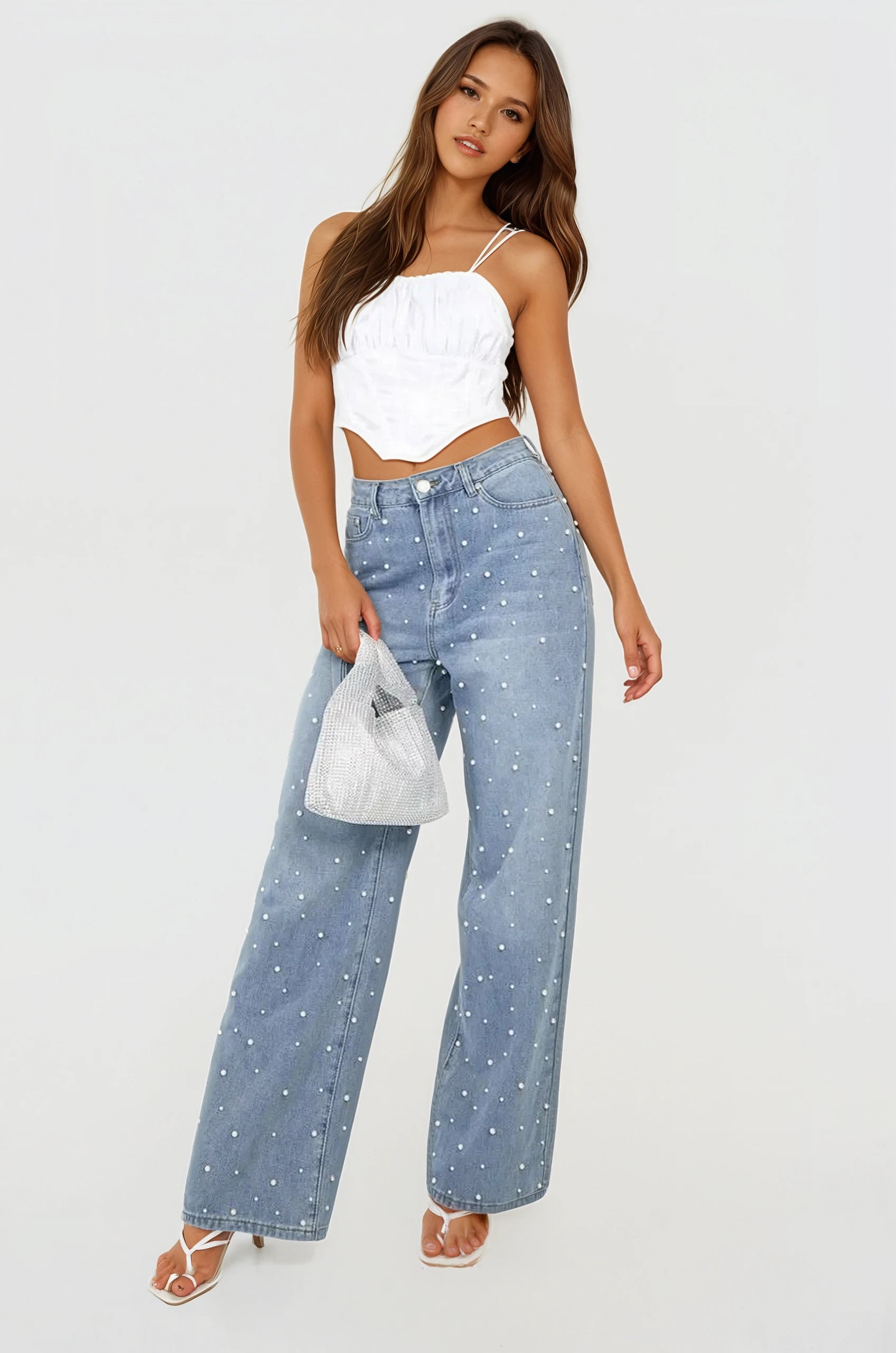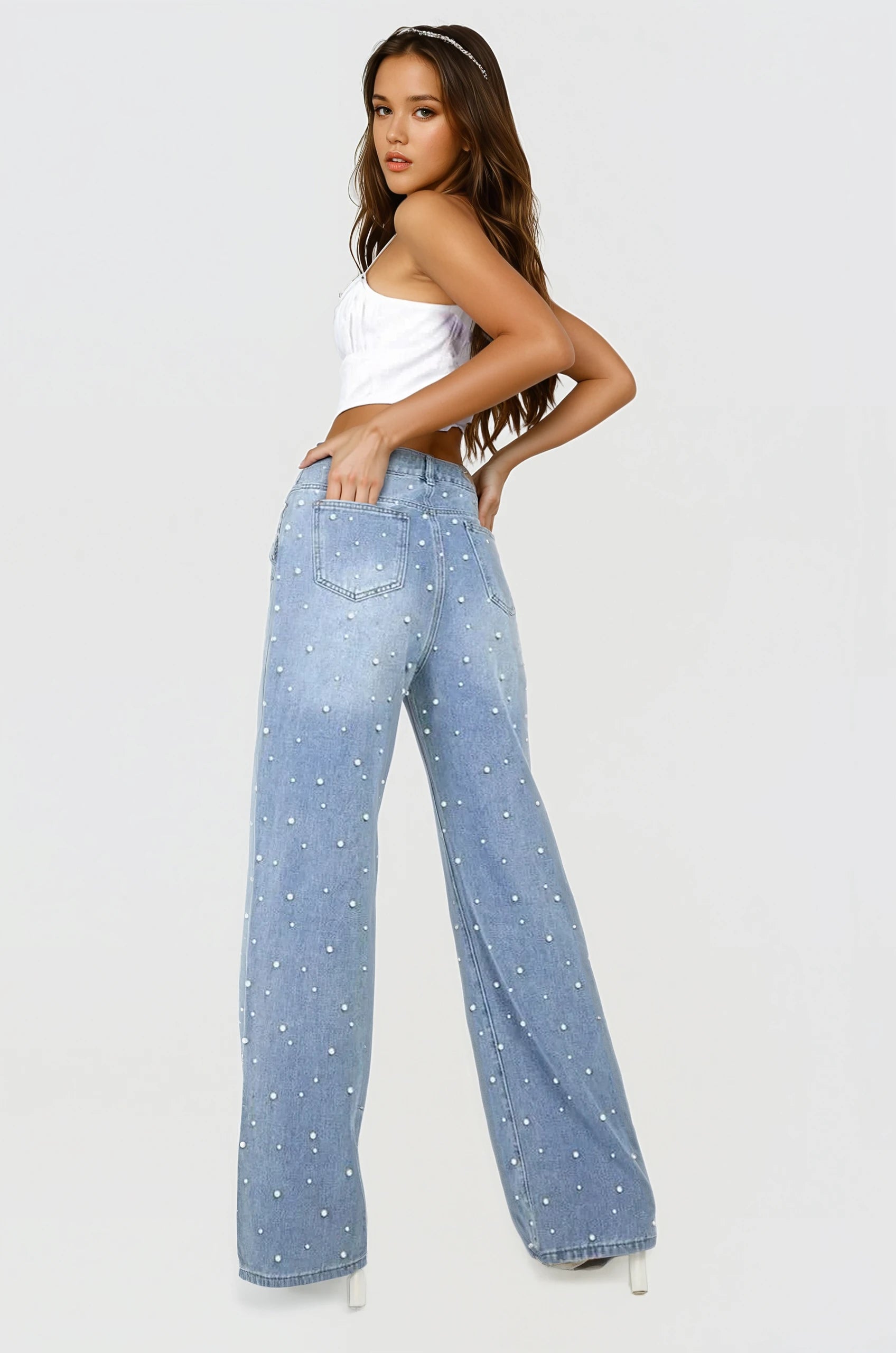 Myra – High Rise Pearl Embellished Wide Leg Jeans