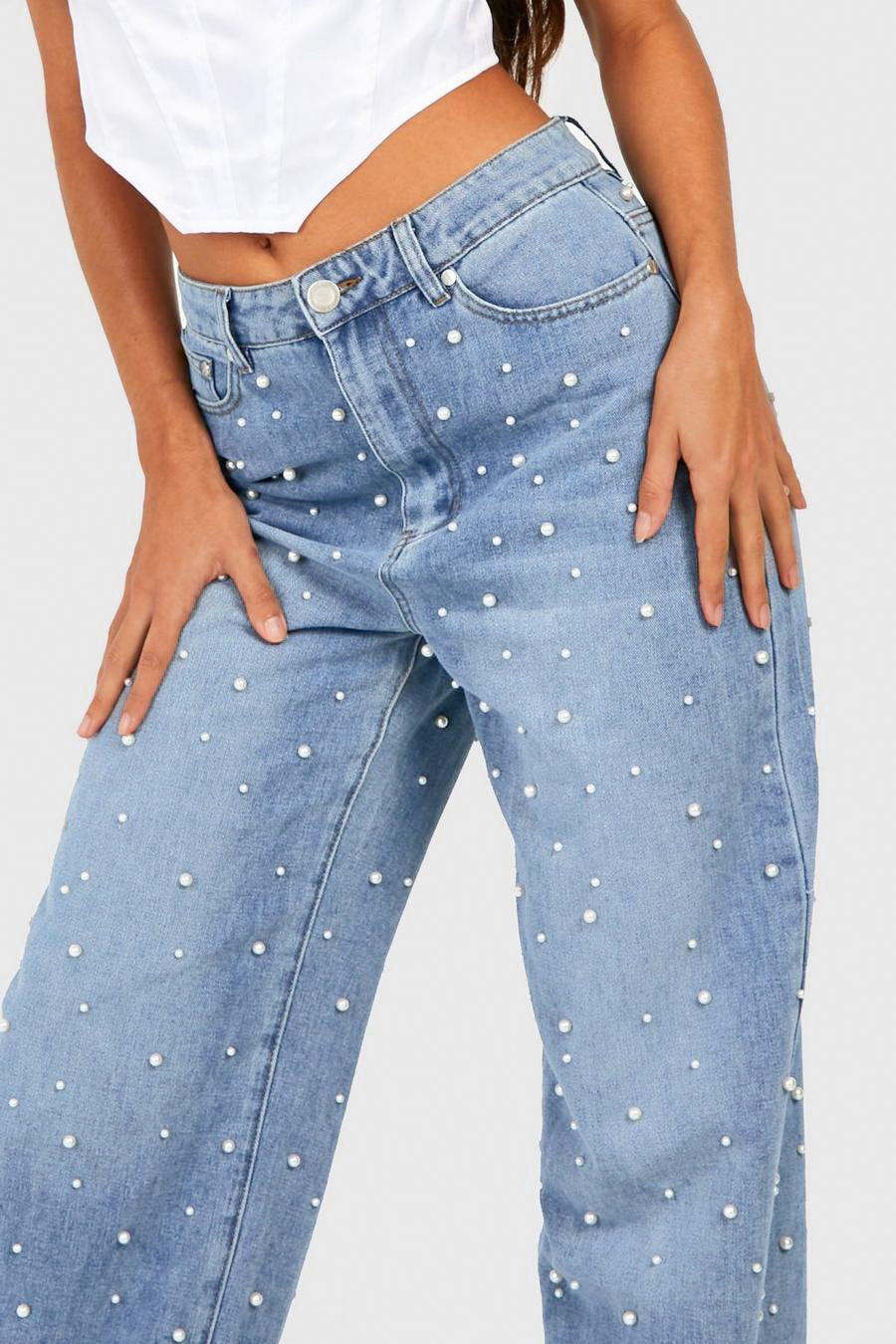 Elevate your evening wardrobe with our Pearl Studded Wide Leg Jeans in Blue. These statement jeans feature a high rise, wide leg silhouette adorned with pearls, giving off glamorous and vogue vibes. Perfect for parties, clubbing, or date nights, these jeans are a must-have fashion statement.