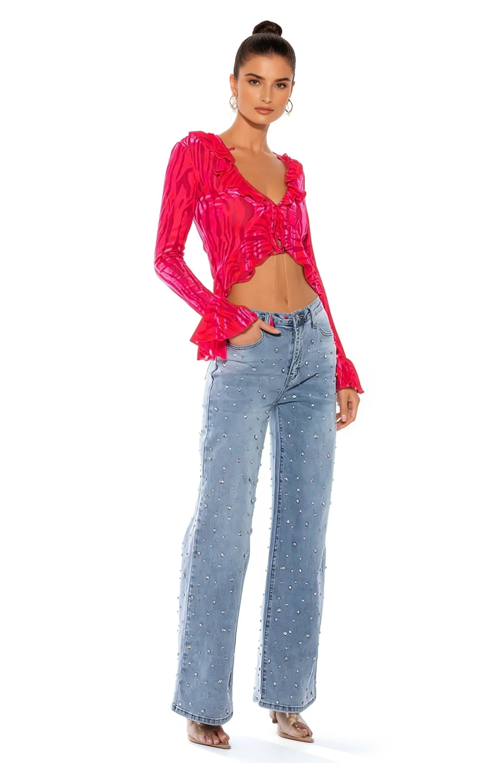 Sparkle and shine in our Rhinestone Embellished Wide Leg Jeans! These versatile jeans are perfect for any occasion, from a red carpet event to a night out with friends. With just the right amount of glam, you’ll turn heads and make a statement wherever you go.