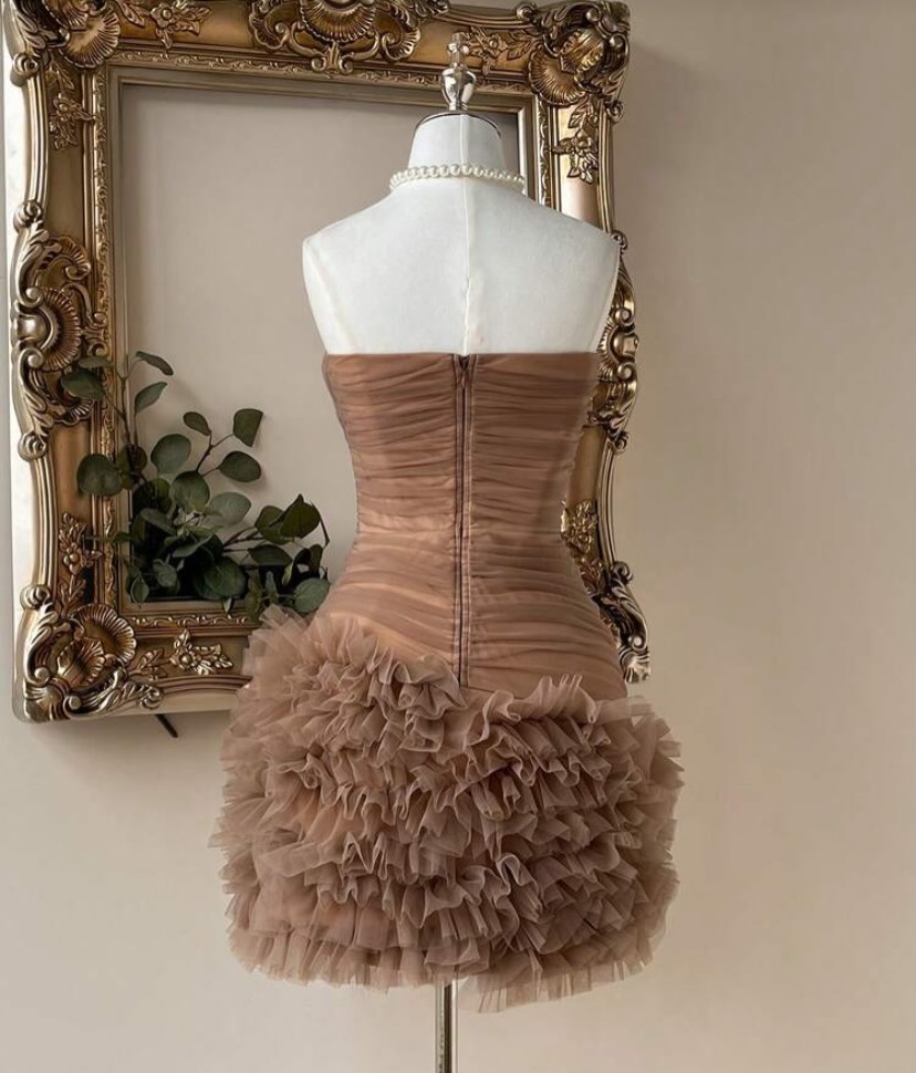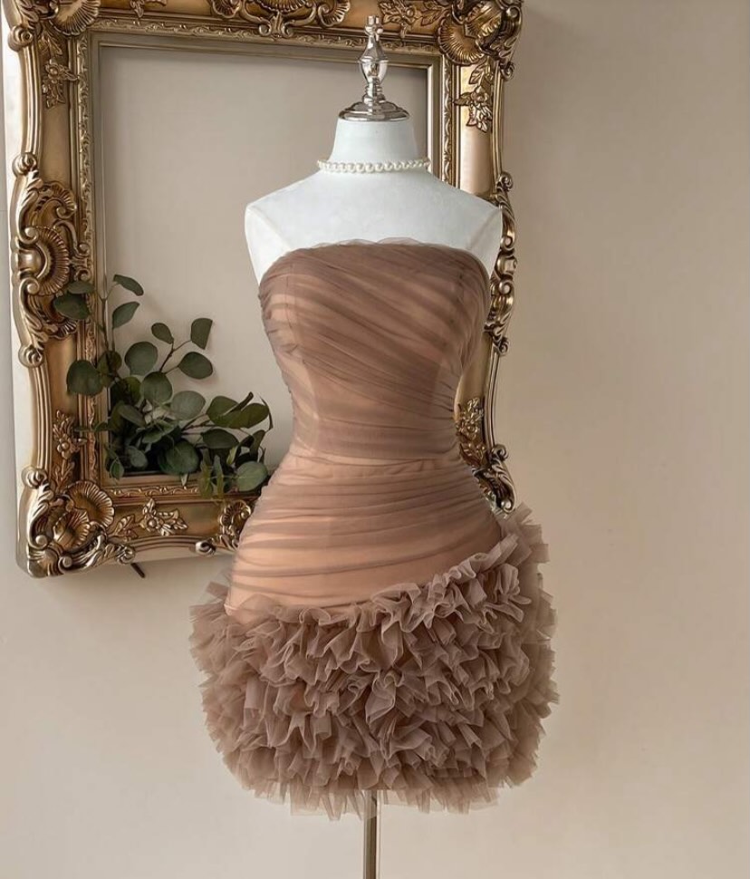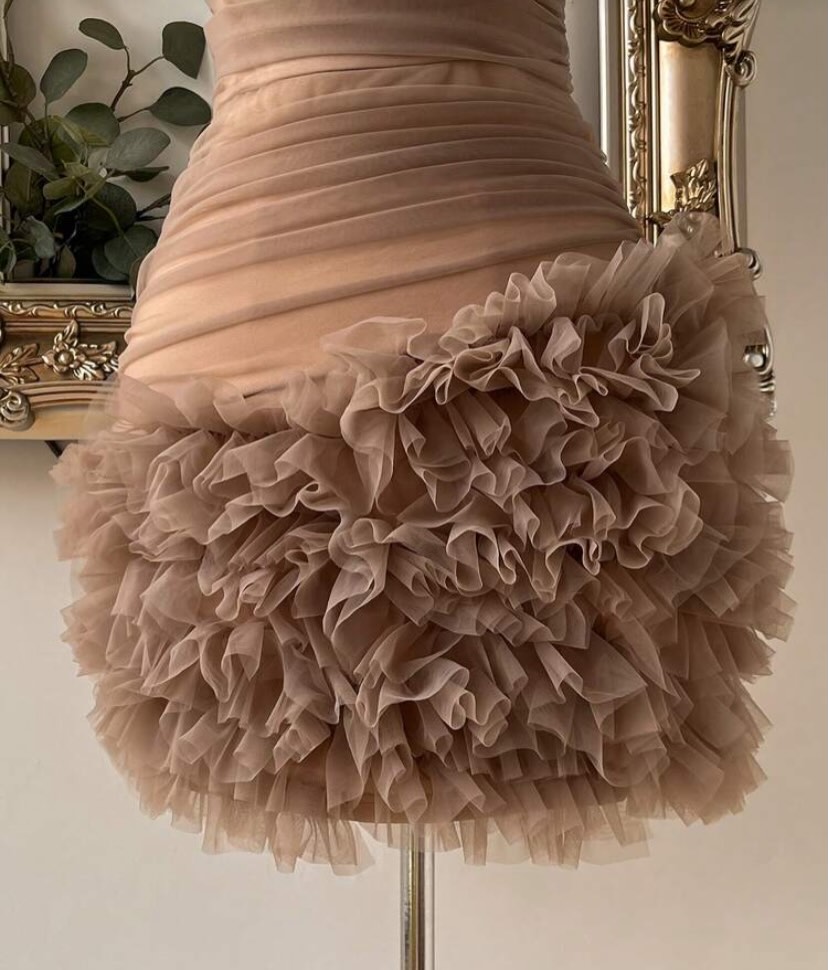 Nude brown soft tulle net strapless bodycon dress featuring elegant ruching and a layered ruffle hem, perfect for parties, cocktail nights, and evening wear.