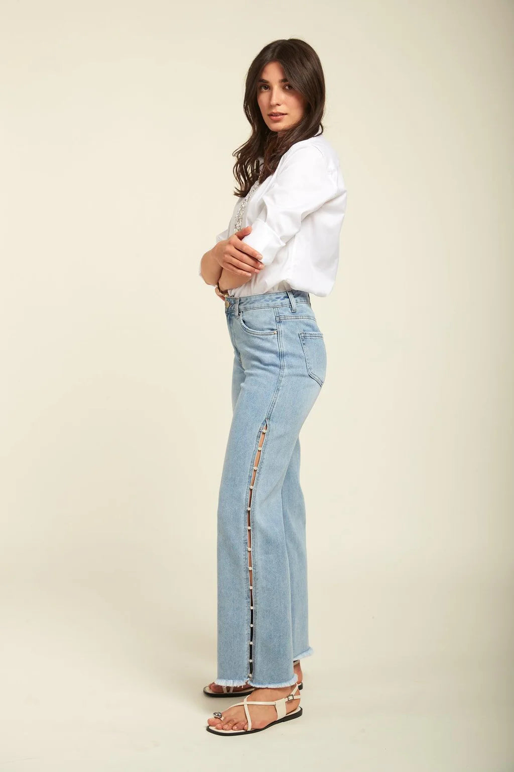 Sparkle and shine in our Pearl Slit Wide Leg Jeans! These versatile jeans are perfect for any occasion, from a red carpet event to a night out with friends. With just the right amount of glam, you’ll turn heads and make a statement wherever you go.