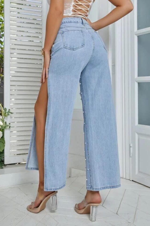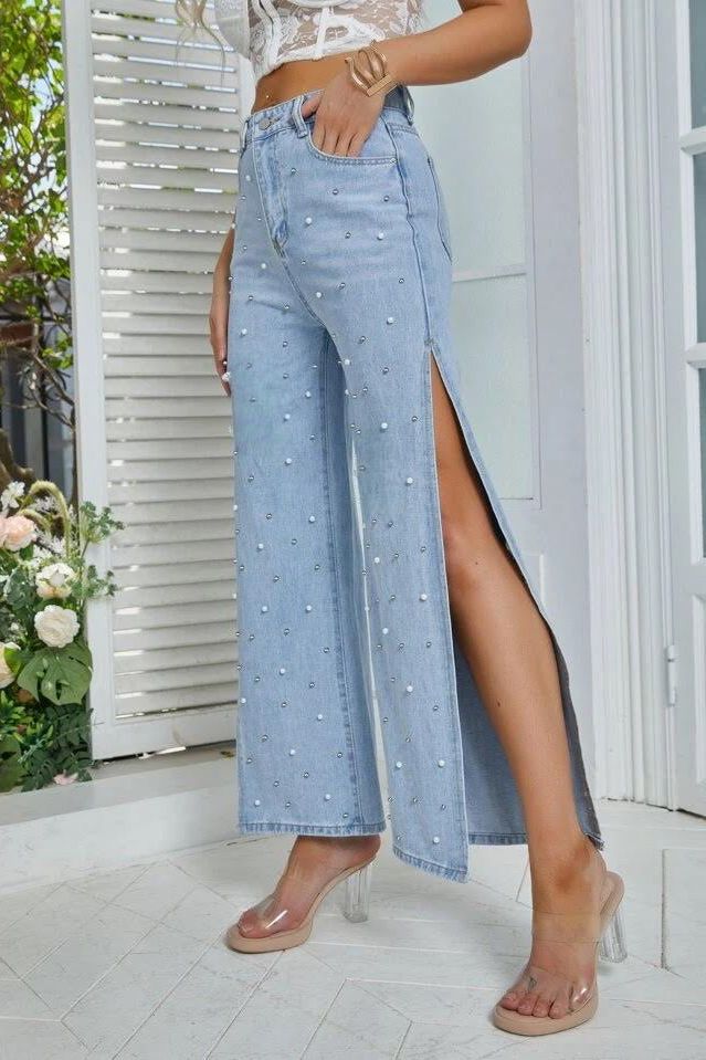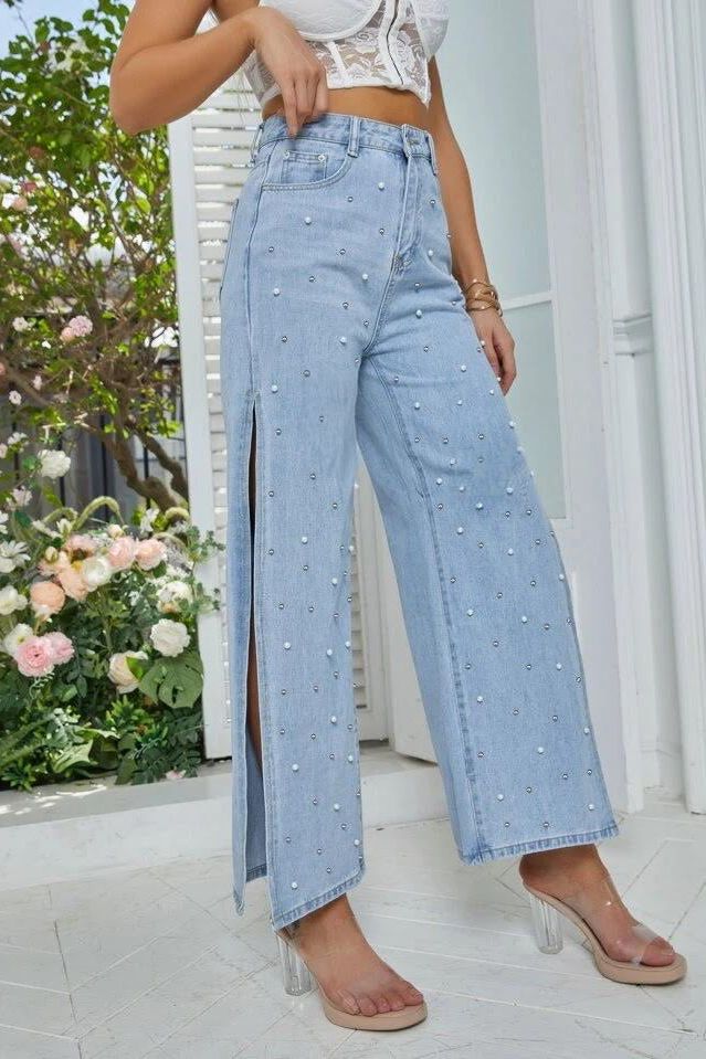 Elevate your evening wardrobe with our Pearl Studded Cut Out Jeans in Ice Blue. These statement jeans feature a high rise, wide leg silhouette adorned with pearls, giving off glamorous and vogue vibes. Perfect for parties, clubbing, or date nights, these jeans are a must-have fashion statement.