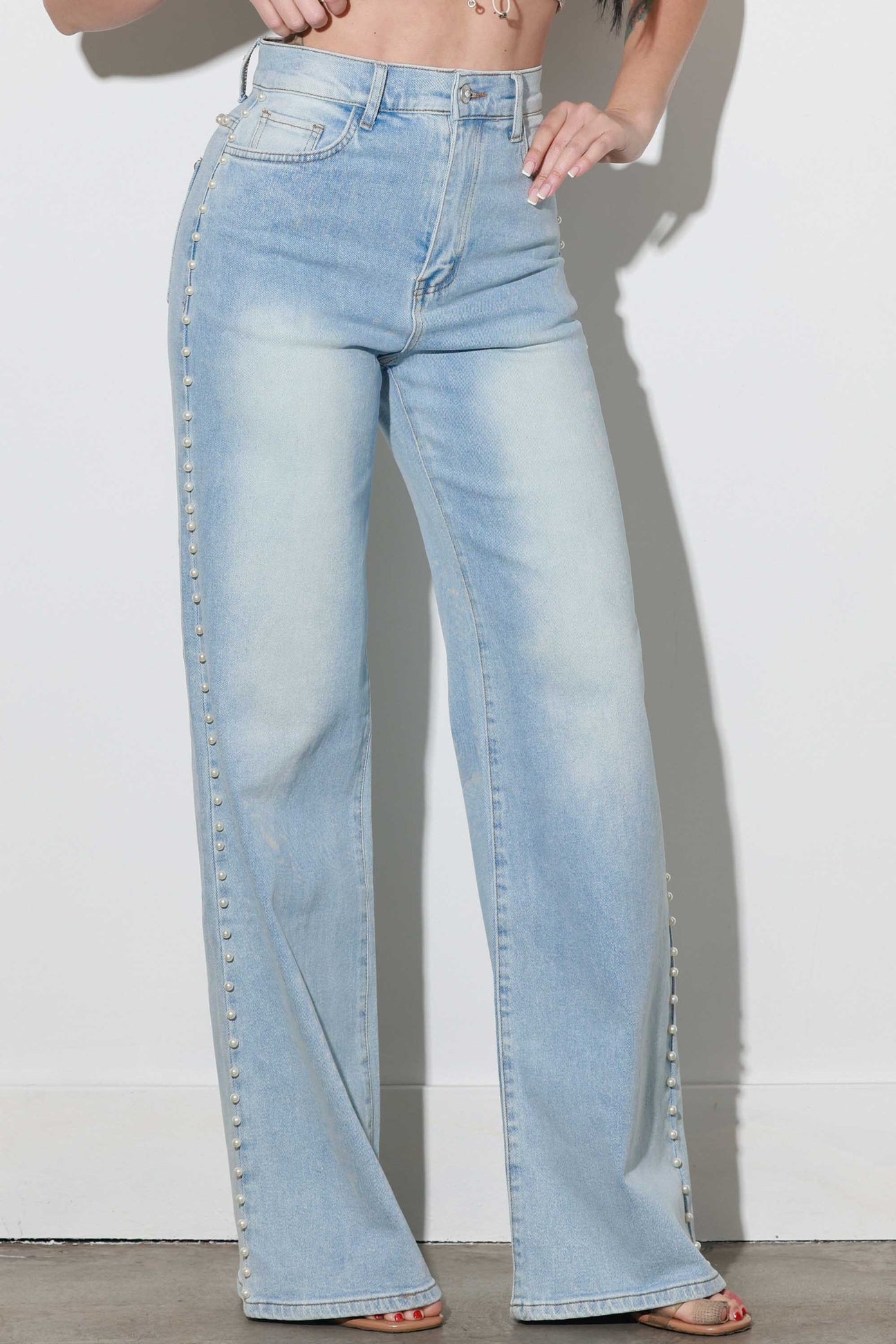 Elevate your evening wardrobe with our Pearl Studded Wide Leg Jeans in Ice Blue. These statement jeans feature a high rise, wide leg silhouette adorned with pearls, giving off glamorous and vogue vibes. Perfect for parties, clubbing, or date nights, these jeans are a must-have fashion statement.