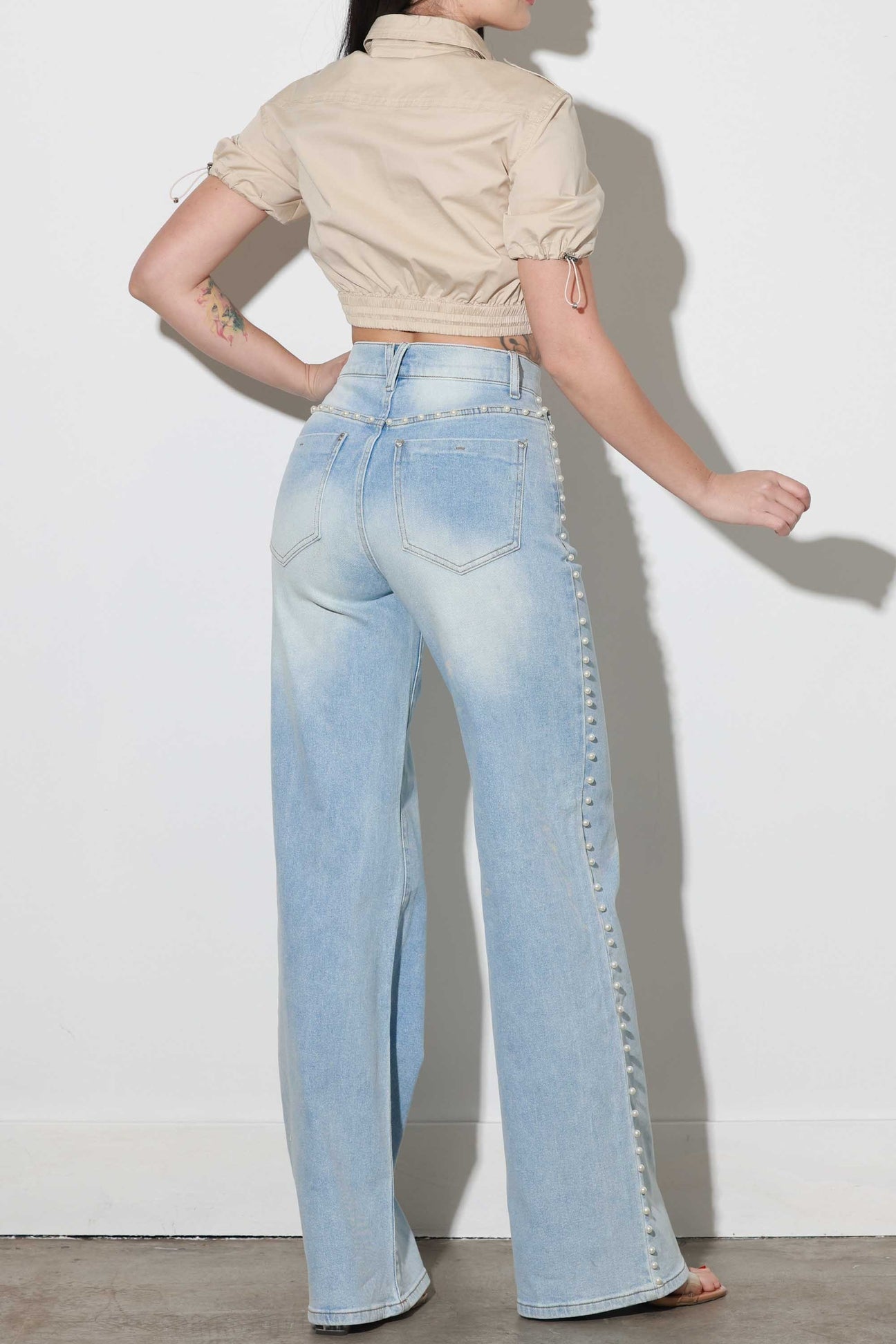 Pearl Studded Wide Leg Jeans – Ice Blue
