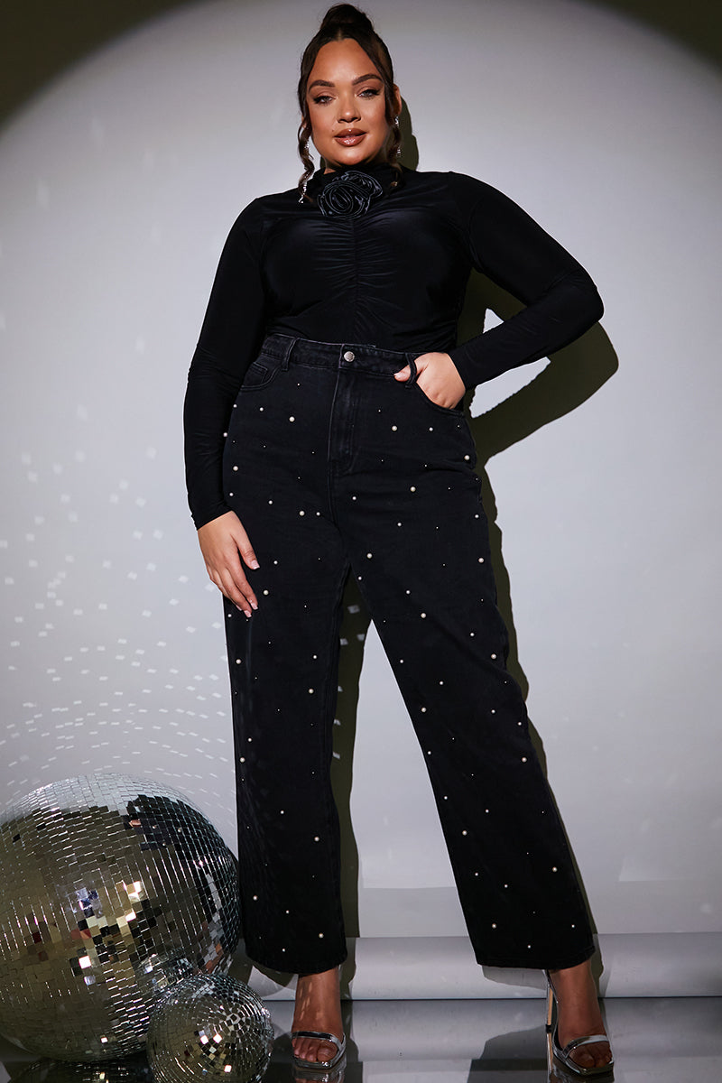 Rhinestone and Pearl Studded Wide Leg Jeans – Black