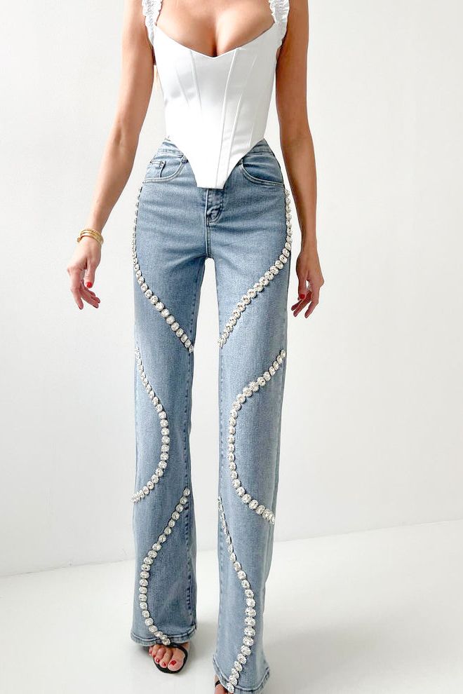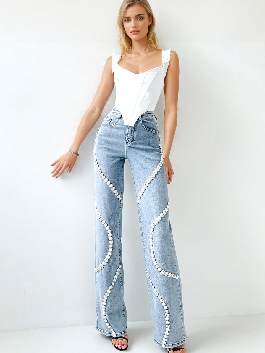 Rhinestone Embellished Wide Leg Jeans - Athena