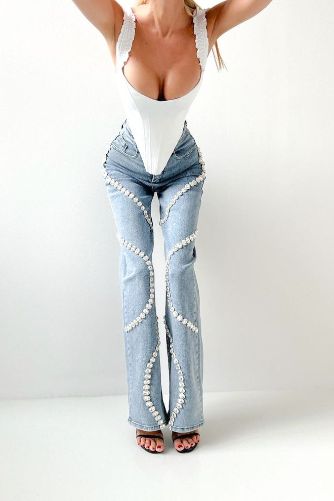 Ophelia – Pearl Embellished Wide Leg Jeans – Ice Blue