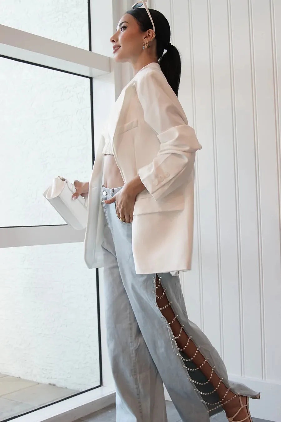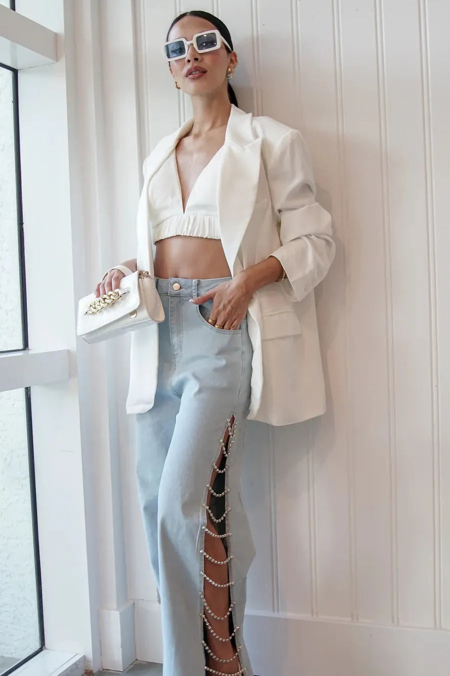 These rhinestone-embellished cut-out denim jeans are a must-have for those who love to stand out. Perfect for adding a touch of glamour to both party and casual outfits, they offer a unique blend of luxury and relaxed style.