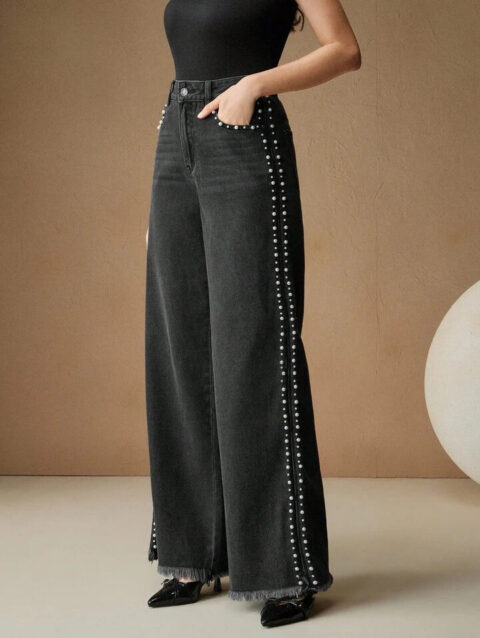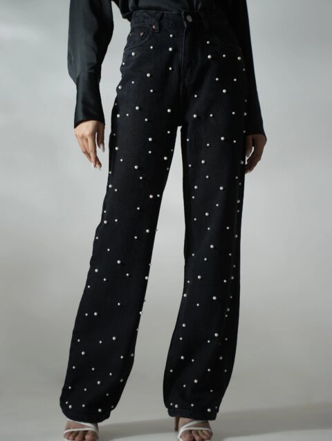 Rhinestone and Pearl Studded Wide Leg Jeans – Black