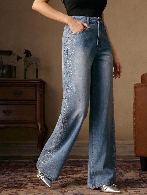 Rhinestone Embellished Wide Leg Jeans Stone Blue