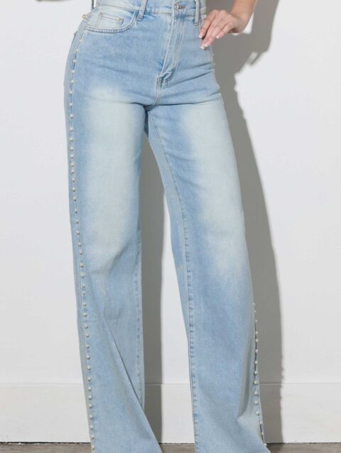 Pearl Studded Wide Leg Jeans – Ice Blue