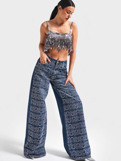 Emma – Rhinestone Embellished Wide Leg Jeans – Dark Blue