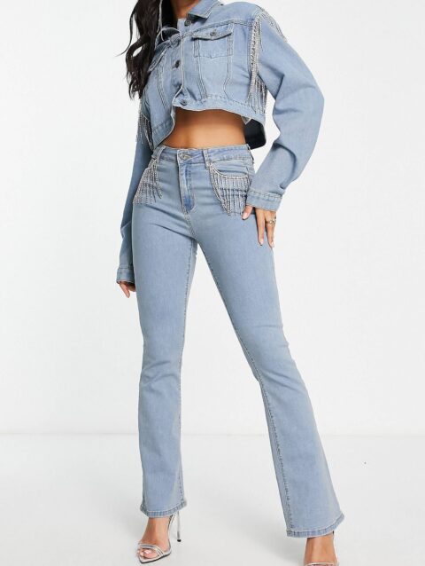 Rhinestone Fringe Boot Cut Flared Jeans Ice Blue