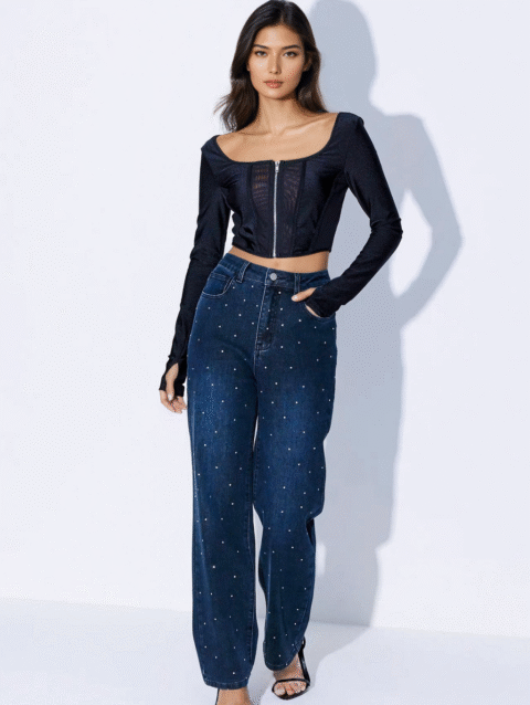 Cut Out Rhinestone Embellished Wide Leg Jeans